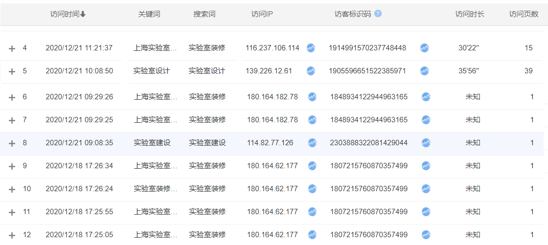 所以我建议最好是每次就一个搜索词点击广告后,在对手的着陆页面上进行深入研究,并浏览多个重要的页面,至少让对手不舍得把你屏蔽,就像上图的第4、5条数据,访问时长都是30分钟以上,访问页数都超过了10页,如果不分析每个页面的访问轨迹,一般人是分不清这两条是对手还是客户的访问数据。