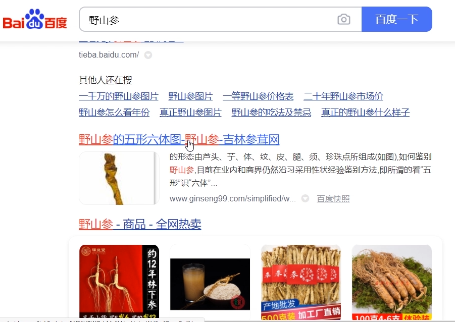 我们用搜索结果来说明免费流量。比如搜“野山参”,这是词主要针对2C的客户。