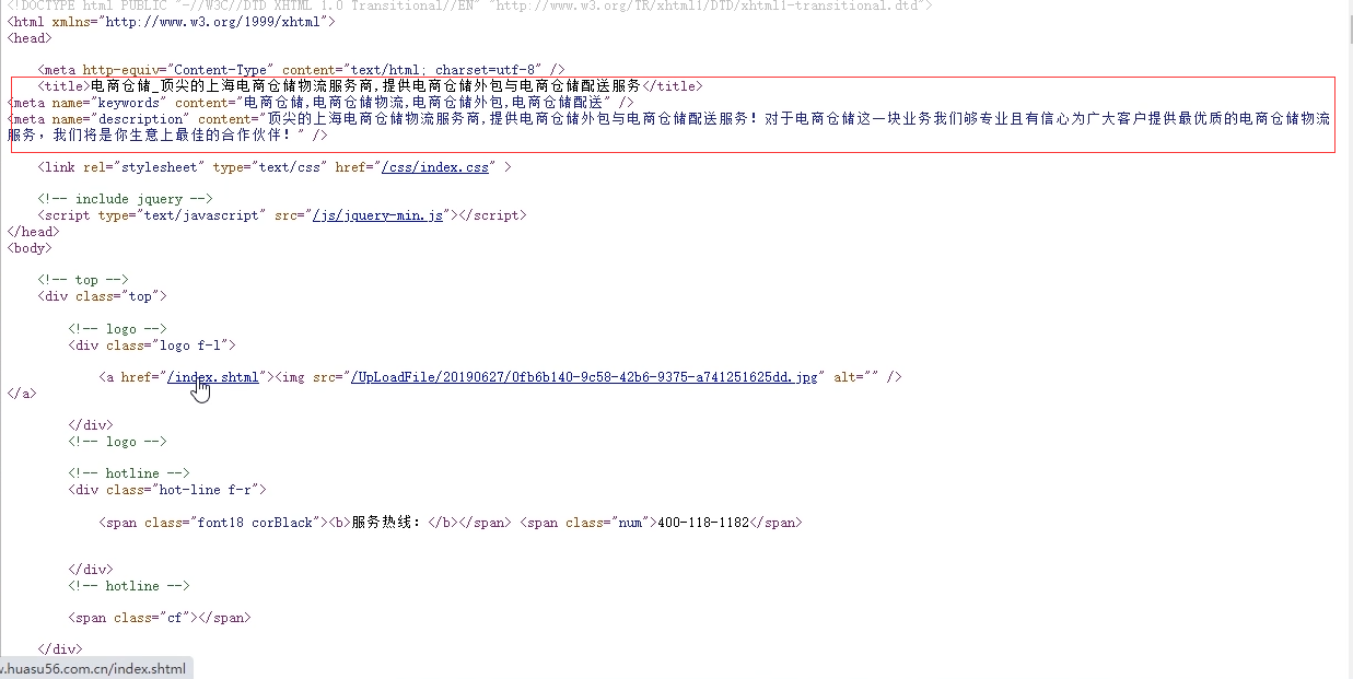 每一个网站排名时当我们看到的标题和描述,其实就是这个后台里面的这个head(头部)里的title(标题)“电商仓储 顶尖的上海电商仓储物流商……”和description(描述)“顶尖的上海商仓储物流服务商,提供电商仓储外包与电商仓储配送服务……”等,这个就是搜索引擎的算法,我们内部叫头部优化。头部优化必须按搜索引擎的算法来做,这样网站才有机会排名在百度的首页,因此需要在每个页面上把头部优化做好,如果不做,是不会有排名的,客户也就找不到你,这就是我们所说的标题和简介,也就是其中的一把钥匙。
