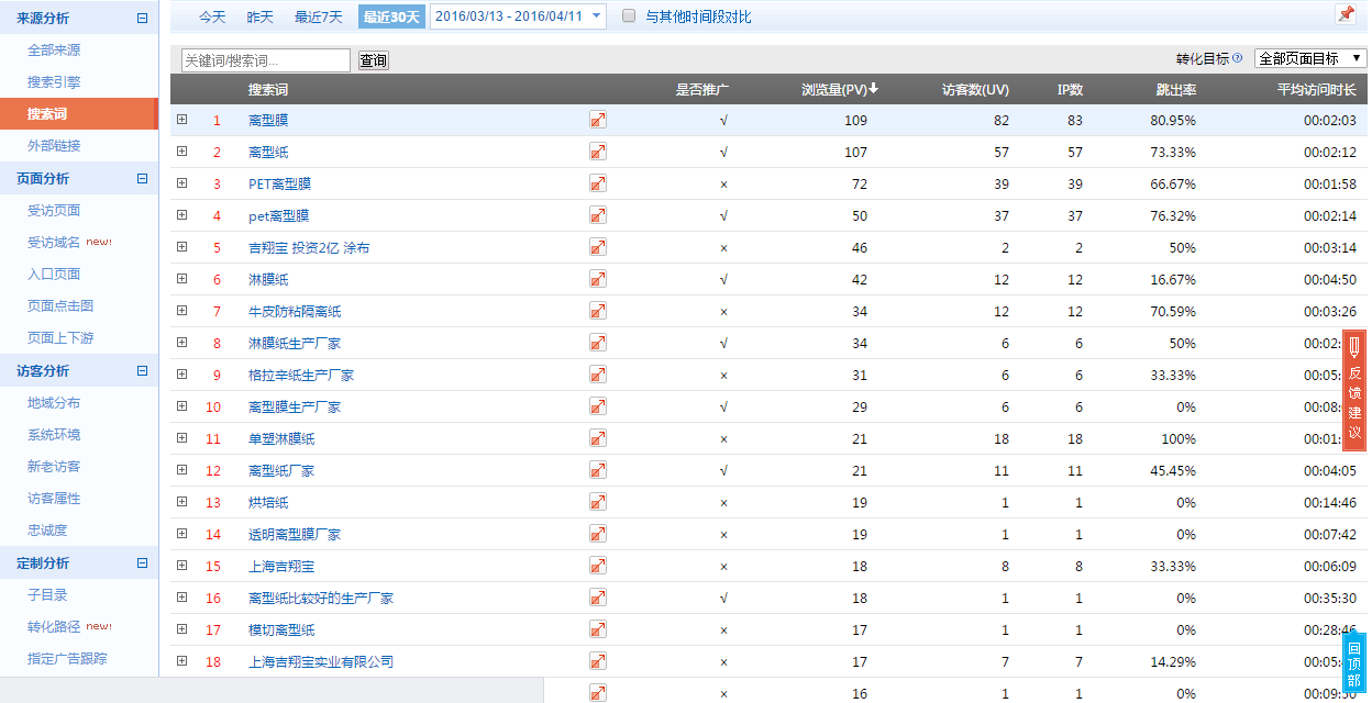 我们通过后台数据还能看到客户对我们哪些页面更喜欢、哪些关键词更迎合客户的心理,通过这些关键词的跳失率和访问时长,就能够挖掘出更有价值的关键词。